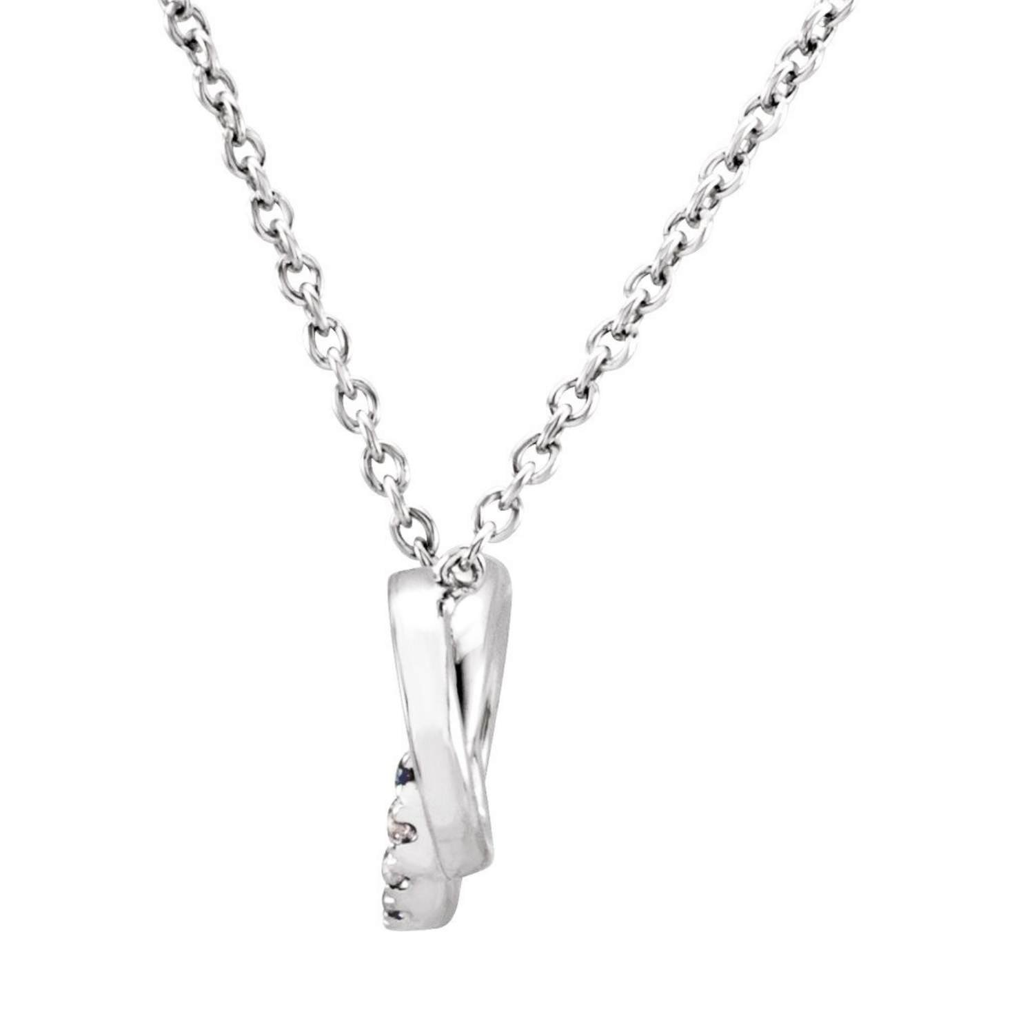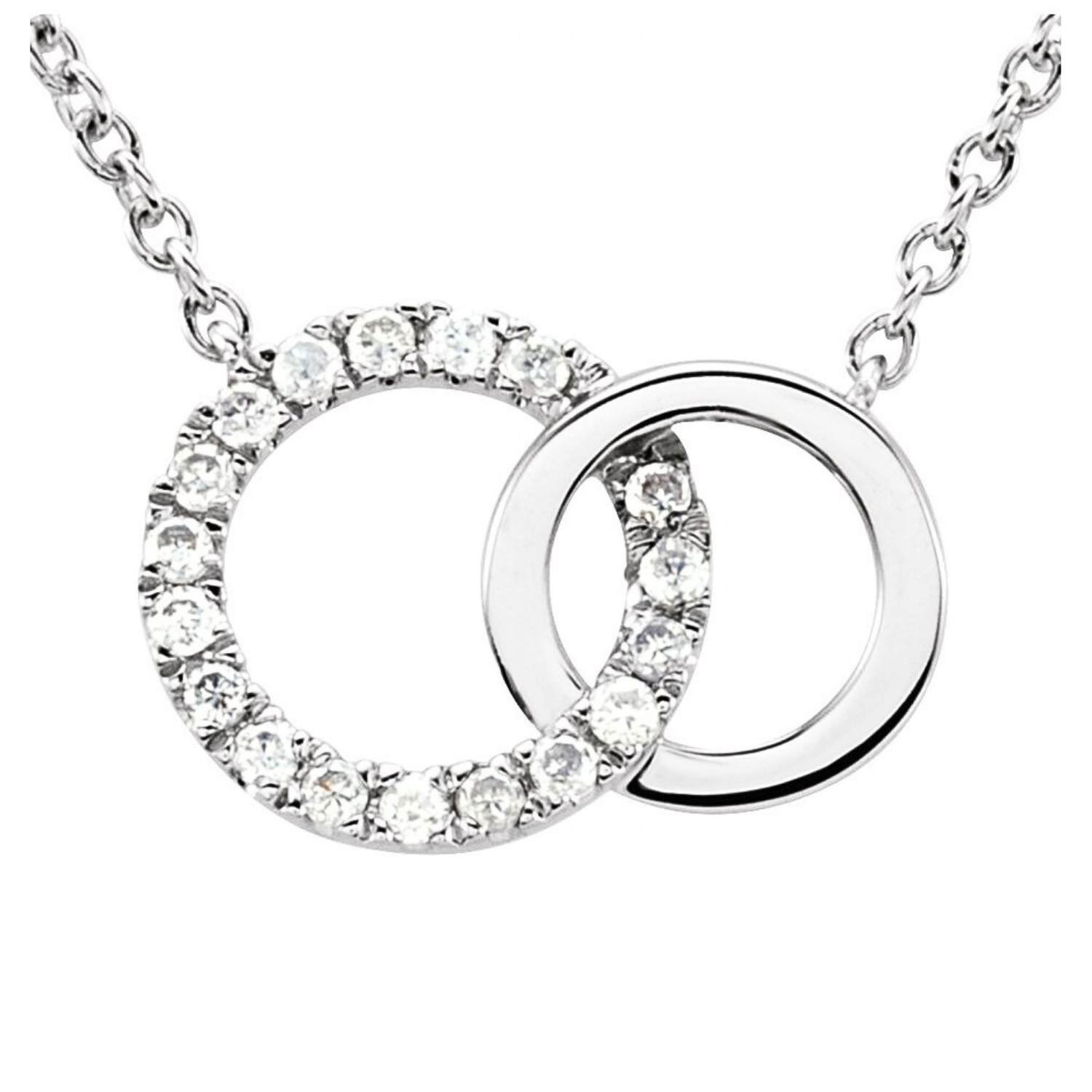 14k white gold Necklace with two interlocking rings, one set with 18 natural diamonds, the other consisting of a plain loop. This unique design symbolizes love and commitment.